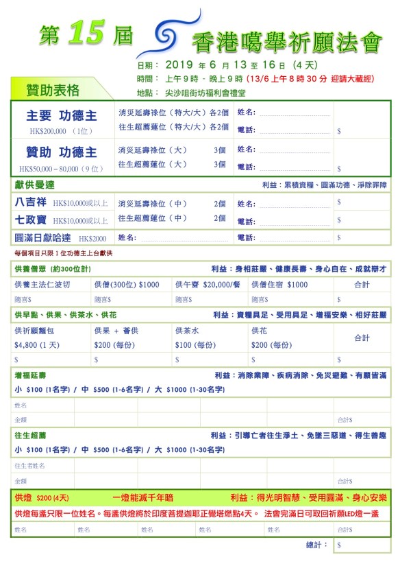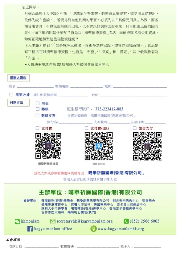 第十八屆香港噶舉祈願法會 1760058000 days hours minutes secondsuntilThe 18th Hong Kong Kagyu Monlam 按此填寫電子表格 下載贊助表格 聯絡 噶舉祈願國際(香港)有限公司 香港天后留仙街3號雅景樓2樓A室 2566 6003 / 9800 2434 / 9459 8874 info.kagyumonlamhk@gmail.com Chat on WhatsApp
