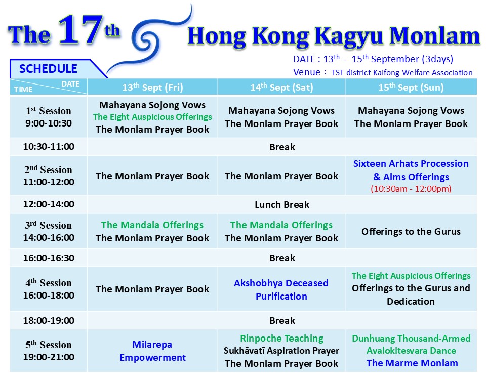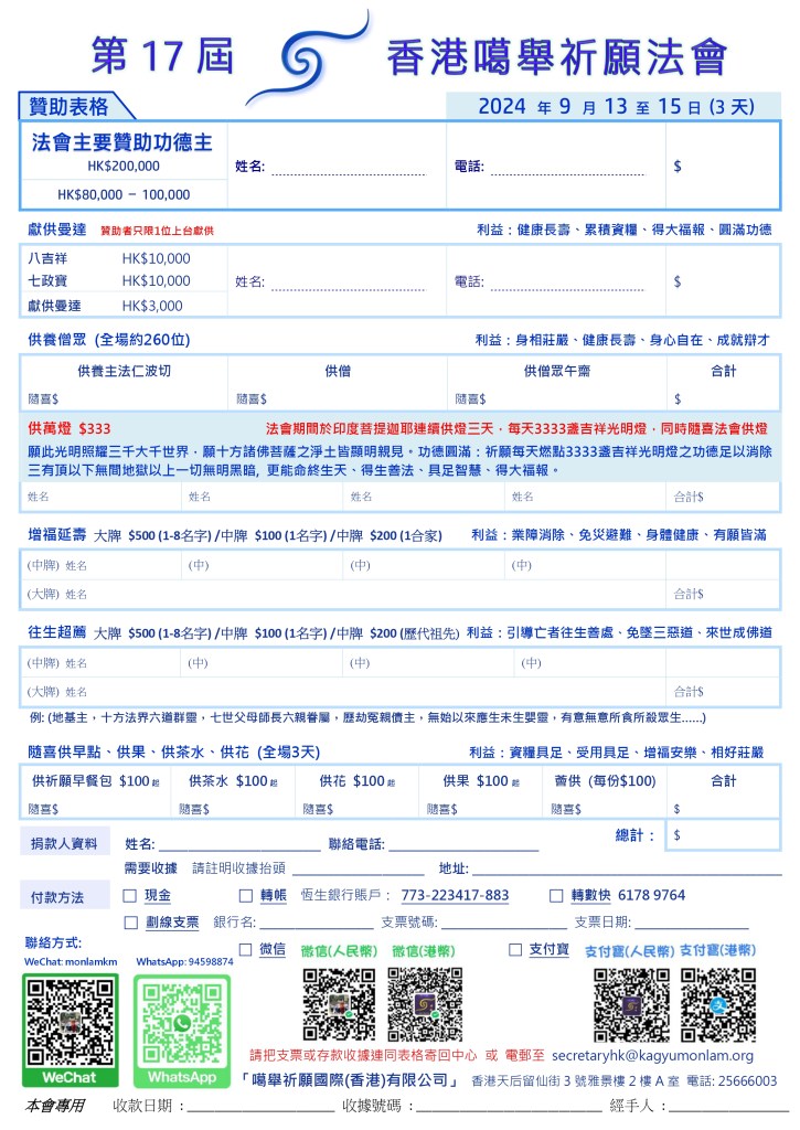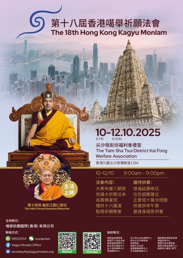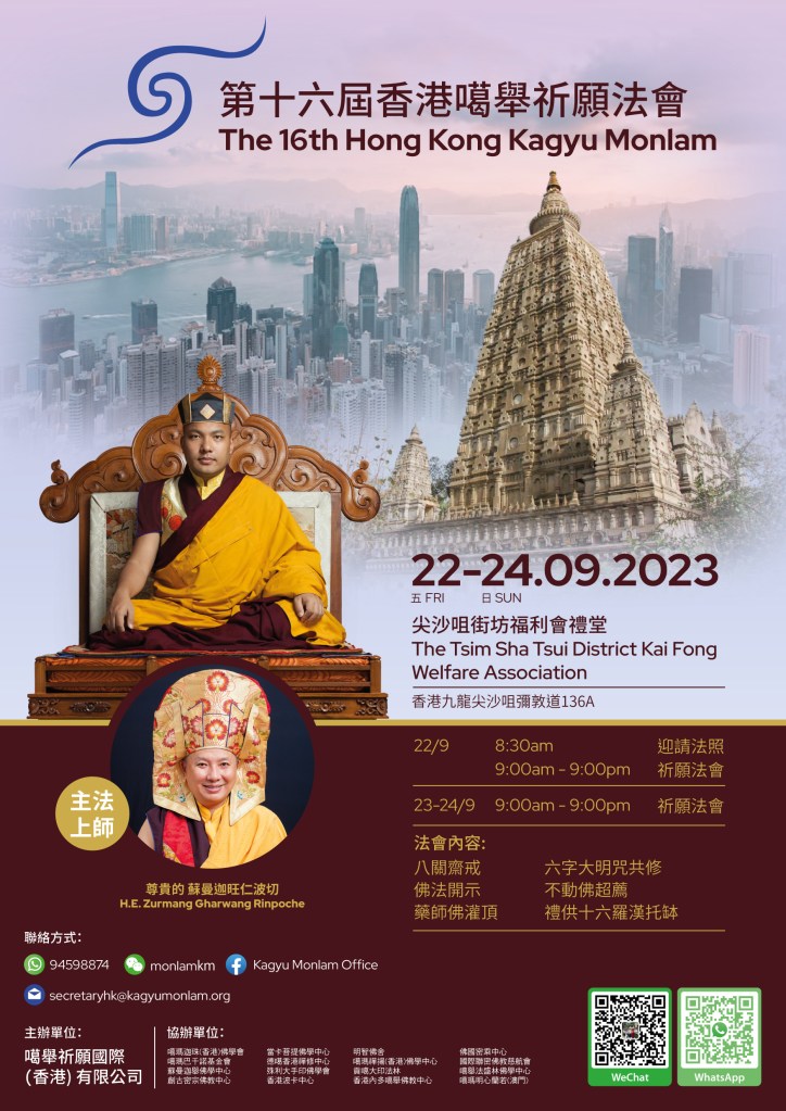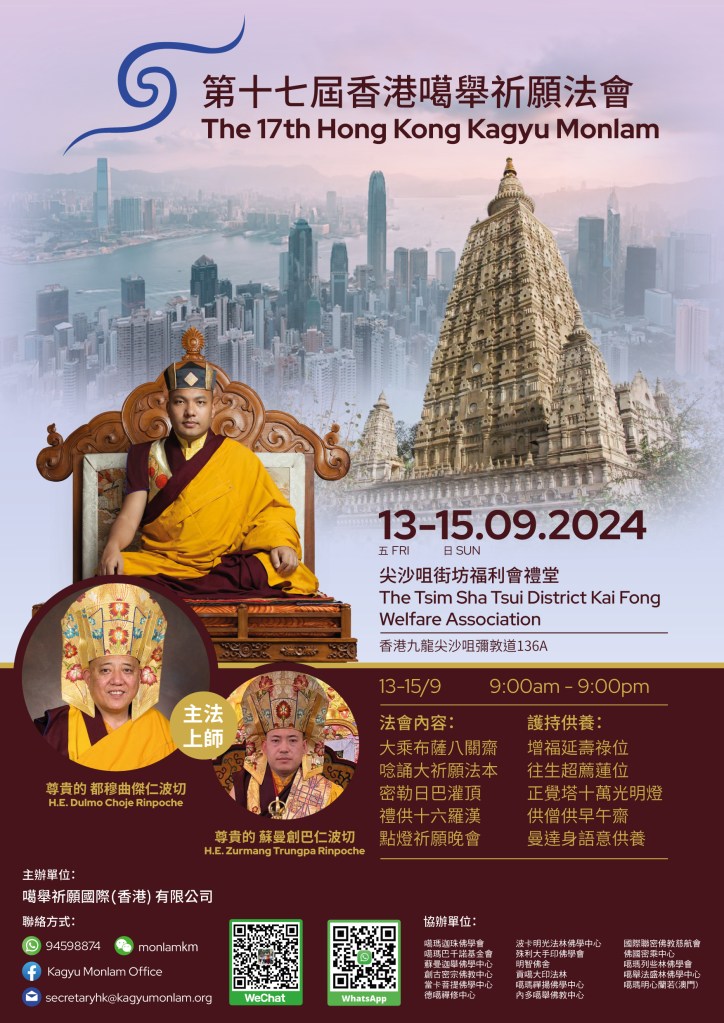 第十七屆香港噶舉祈願法會 1726189200 days hours minutes secondsuntilThe 17th Hong Kong Kagyu Monlam 按此填寫電子表格 下載贊助表格 下載香港祈願法會日程 香港天后留仙街3號雅景樓2樓A室 info.kagyumonlamhk@gmail.com 2566 6003 / 9459 8874 Chat on WhatsApp