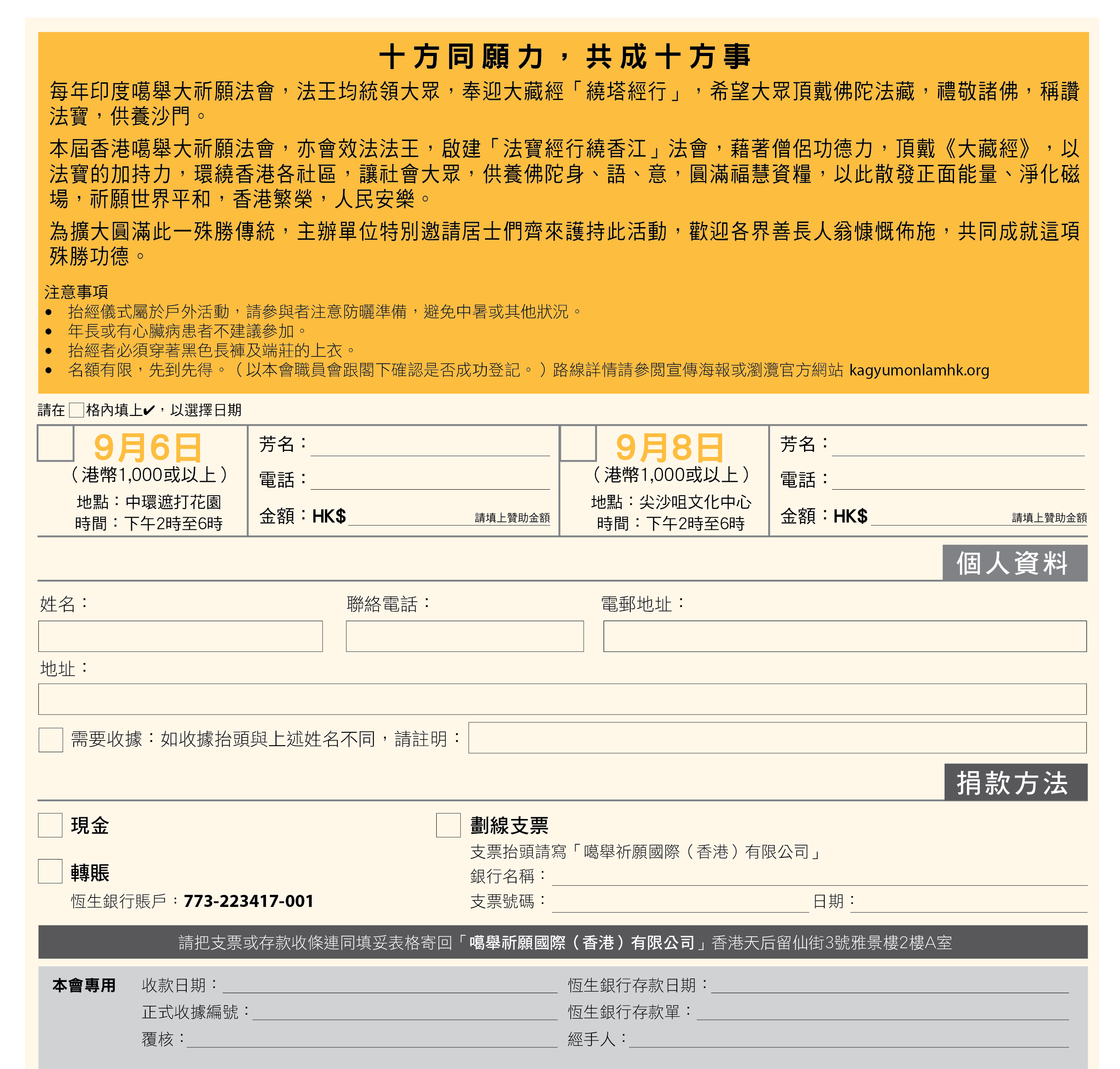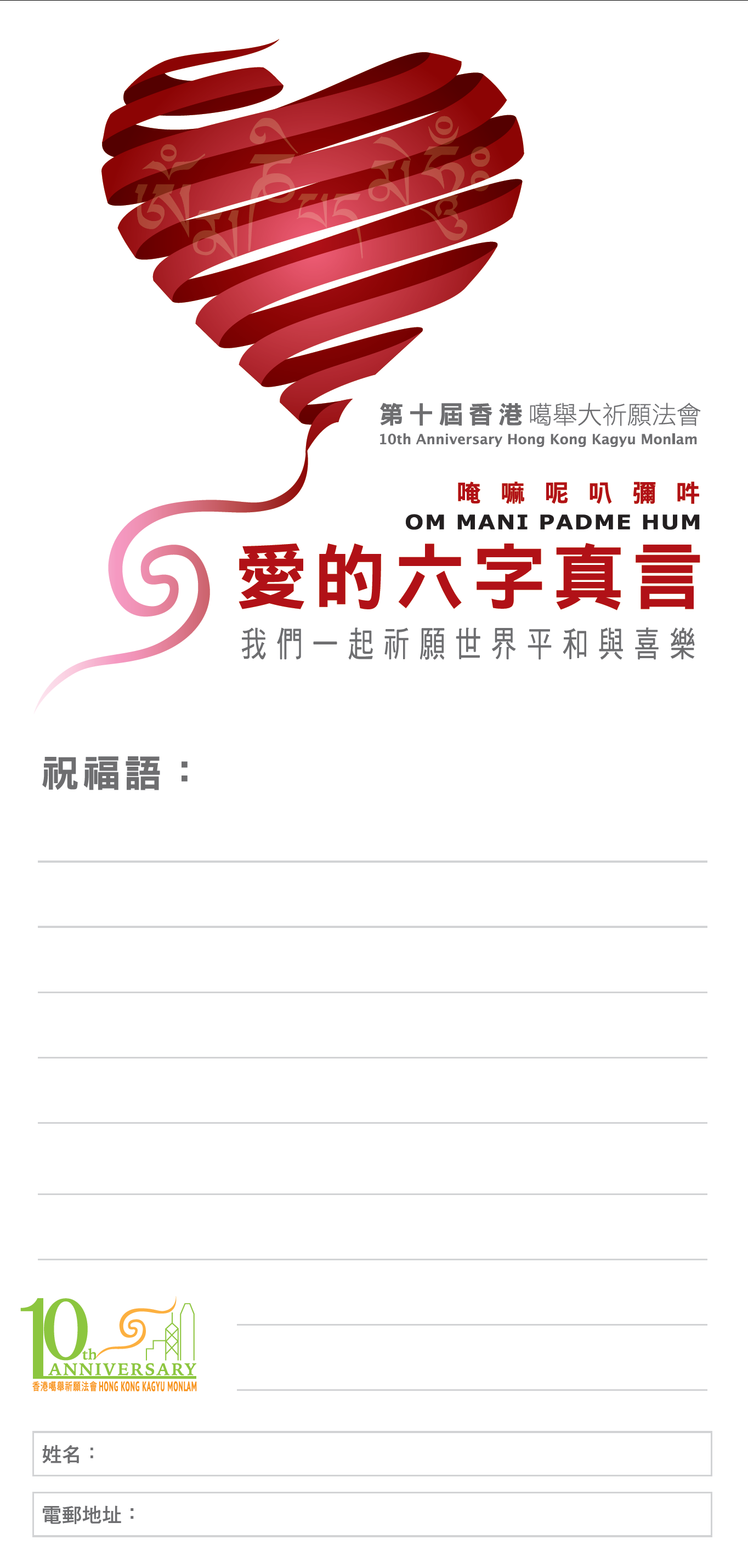現為本屆大祈願法會籌集一億遍六字大明咒「嗡瑪尼貝美吽」的念誦, 祈願世界和平, 各民族宗教融和共生。請各位法友於9月10日前,把持誦的六字大明咒總數以電郵 executive.kagyumonlam@gmail.com 或微信至:hkmonlam